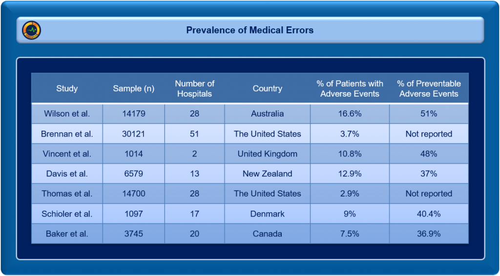 Growing attention to severe consequences resulting from medical errors was generated in 2000 by the Institute of Medicine (IOM) report To Err is Human: Building a Safer Health System. Based on the two large studies and extrapolation to over 33.6 million admissions to the hospitals in the United States the IOM report concluded that between 44,000 and 98,000 Americans die each year as a result of medical errors and many more are seriously harmed. It was truly a startling revelation that more people die every year as a result of medical errors than from motor vehicle accidents, breast cancer or AIDS. In 2004 the Canadian Medical Association Journal published results from a landmark study on the incidence of adverse events among hospital patients in Canada. Dr. Baker and the study team randomly selected one teaching, one large community and two small community hospitals in five Canadian provinces and reviewed the total of 3,745 medical charts for non-psychiatric, non-obstetric adult patients. Physicians reviewed all the positively screened charts to identify adverse events and determine if they were preventable. After adjustment for the sampling strategy, the overall rate of adverse events was 7.5 per 100 hospital admissions. Among the patients who experienced adverse events 36.9% of those events were judged to be preventable while death occurred in 20.8%. It was also estimated that 1,521 additional hospital days were associated with adverse events. By extrapolation, results of this study suggest that every year about 185,000 hospital admissions are associated with an adverse event and close to 70,000 of these adverse events are potentially preventable. Allowing for the differences in definitions and methods used, several retrospective studies carried out in Australia, the United States, Denmark, United Kingdom, New Zealand, and other countries around the world produced similar results. The results of these studies are summarized in the table below.